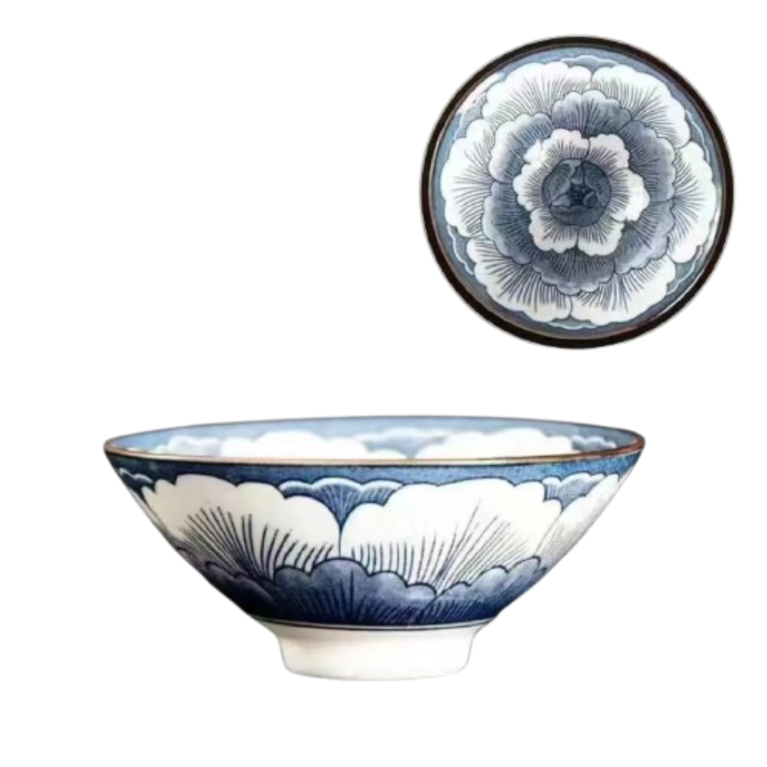 Handcrafted blue-and-white porcelain tea cup made from ceramic. Available in Lotus Blossom, Phoenix, Blooming Flowers, and Koi Fish designs. Suitable for tea or general beverage use. Each pack includes 1 cup.